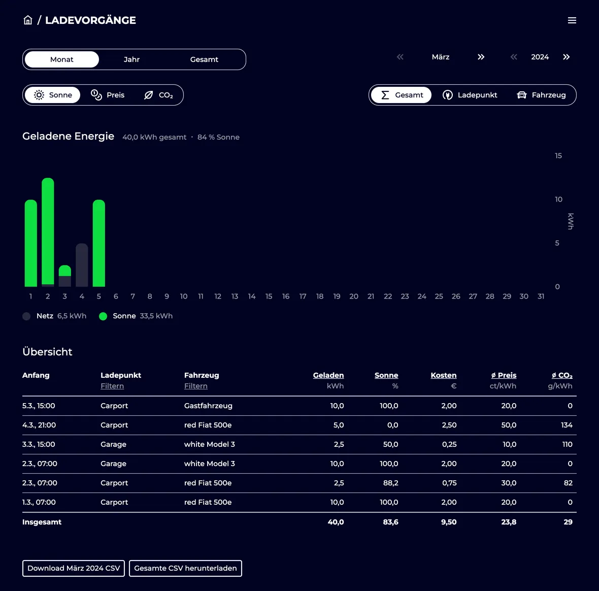 Im Menü unter "Ladevorgänge" findest du eine Liste aller bisherigen Ladevorgänge nach Monaten gruppiert. Die Daten sind tabellarisch aufbereitet und können als CSV-Datei exportiert werden. Du kannst nach Ladepunkt und Fahrzeug filtern und dir Summen und Durchschnittswerte anschauen.