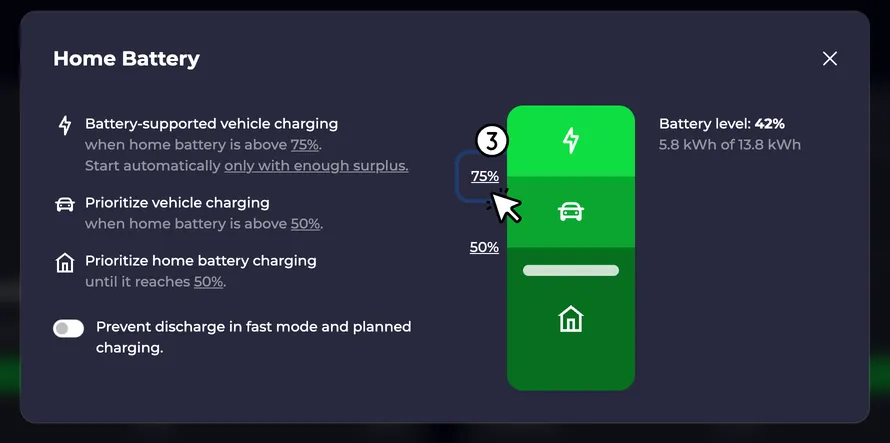 Example: You set the limit to 50%. This means that solar energy flows into the home battery first. If the battery reaches a charge level of 50%, charging points that are in Solar mode are released. The charging power is regulated so that the home battery maintains its charge level. If no vehicle is connected, excess solar energy naturally continues to go into the home battery.