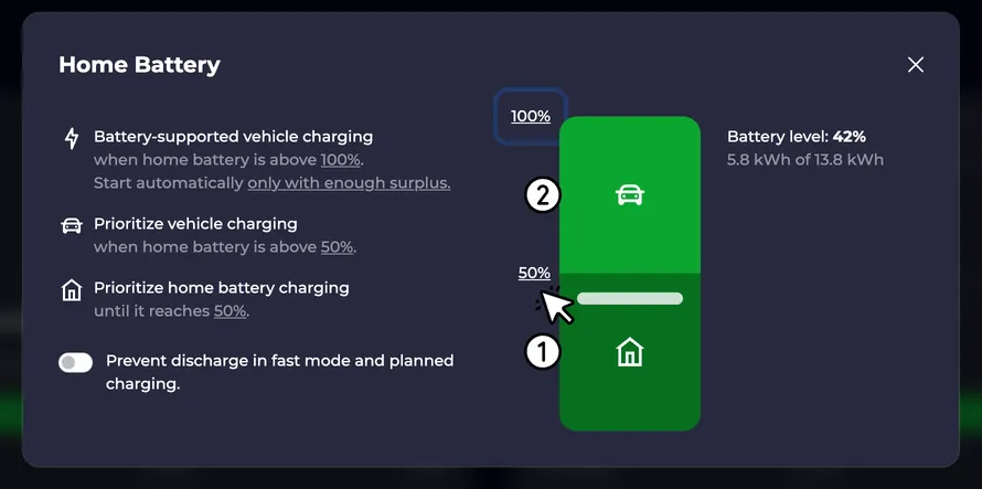 Here you set the charge level up to which the home battery should be charged with priority and from when the electric car can use the surplus. With the lower limit you determine how much energy is reserved for home consumption (1) and in which area the vehicle has priority (2).